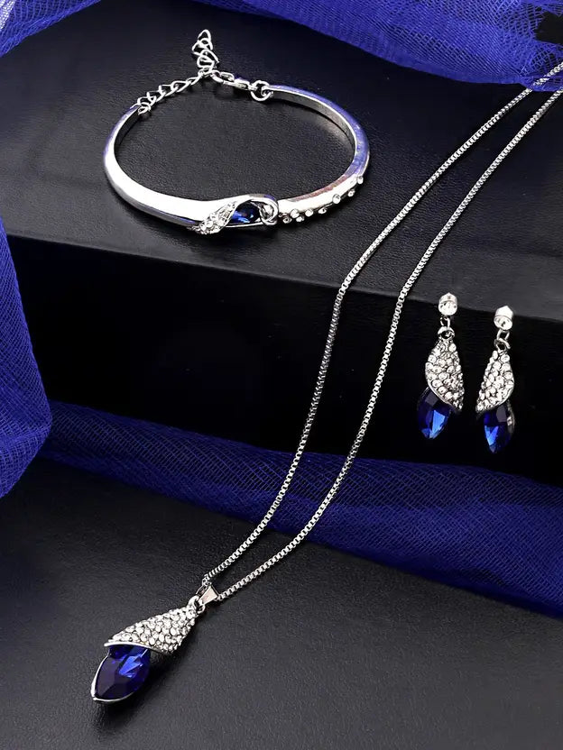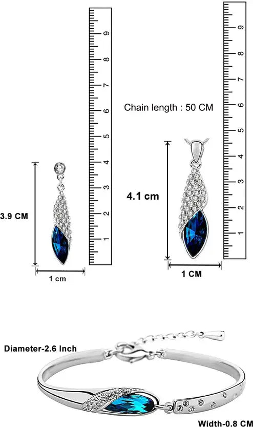 BEAUTY- This Crystal Pendant Set is a Perfect set in your Jewellery Collection for formal or casual wear. Lovely combination of blue crystal over a filigree design making it a very attractive and all time match for all women, a must have piece to add to your jewellery treasure Combo Of Pendant With Chain, Earrings And Bracelet. SKIN FRIENDLY- Alloy (97% tin and 3% bismuth). Nickel free and Lead free as per International Standards GIFT FOR HER! - Ideal Valentine, Birthday, Anniversary gift for someone you ? LOVE ?. With our packaging Box, you do not need to opt-in for any additional gift packaging. The product comes in a beautiful Elegant Ready-to-Gift Box.